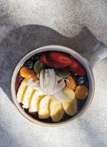 L’alimentation est au cœur de la philosophie Blossom. Les repas sont végétariens à 100 %, dont 60 % crus, élaborés à partir de produits locaux et de saison. Jus verts pressés à froid, tisanes de plantes, salades colorées et bouillons parfumés accompagnent chaque étape du processus.
