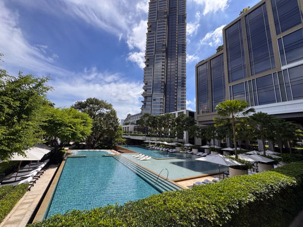 Bei der Ankunft ist es unmöglich, nicht von der Größe und Eleganz der Architektur beeindruckt zu sein. Das Hotel wurde von dem berühmten Architekten Jean-Michel Gathy entworfen, der bereits für seine ikonischen Bauten in Asien bekannt ist. Hier entwarf er einen Komplex, der sich entlang des Flusses erstreckt, mit einer Reihe von Teichen und Wasserflächen, die den Blick auf natürliche Weise auf den Chao Phraya lenken.