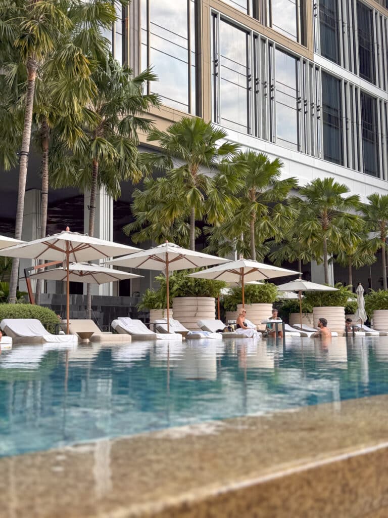 Wenn es einen Ort gibt, an dem ich viel Zeit verbracht habe, dann ist es der Hauptpool. Er erstreckt sich wie ein Spiegel über den Fluss und ist von Palmen und perfekt ausgerichteten Liegestühlen umgeben. Der Effekt ist verblüffend: Man fühlt sich wie in einem Strandresort, obwohl man sich im Herzen einer brodelnden Hauptstadt befindet.
