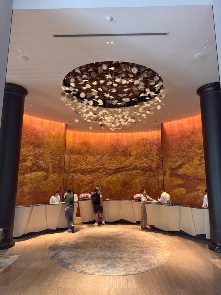 Die Räume sind großzügig, die Linien sind klar und das natürliche Licht strömt überall hin. Marmor, dunkles Holz und grüne Akzente schaffen eine moderne, aber warme Atmosphäre, in der man sich sofort wohl fühlt. Es gibt auch viele Anspielungen auf die thailändische Kunst und Kultur, die auf subtile Weise integriert wurden und dem Hotel eine echte lokale Identität verleihen.