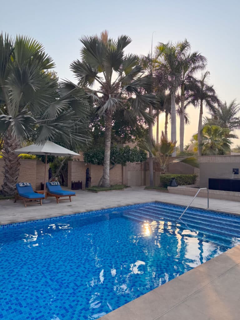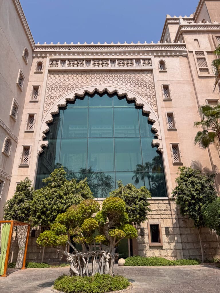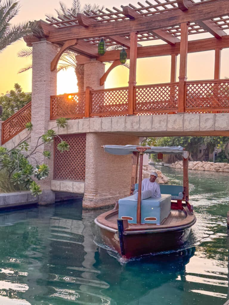 L’originalité du lieu tient en grande partie à la possibilité de se déplacer en abra, ces petites embarcations traditionnelles qui serpentent entre les lagons turquoise et relient les différentes parties du complexe. Se laisser glisser sur l’eau, admirer l’architecture d’inspiration arabe et respirer un air un peu plus frais que dans le reste de la ville m’a procuré un vrai premier sentiment de bien-être.