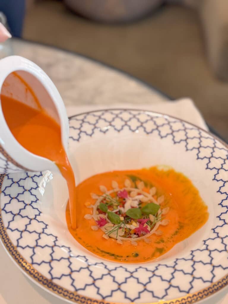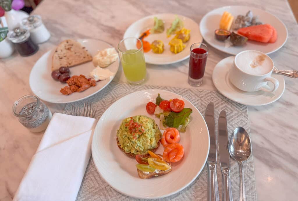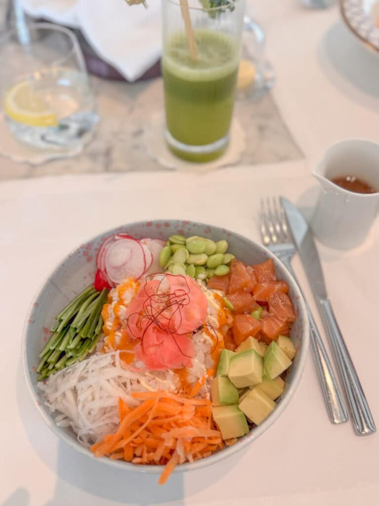 Le Madinat compte de nombreux restaurants, mais j’ai choisi d’explorer des options bien spécifiques. Dans un des espaces lounge de l’hôtel, un menu healthy est proposé : plats équilibrés, jus frais, options végétariennes… Une manière élégante de rester fidèle à une alimentation légère, même en vacances.