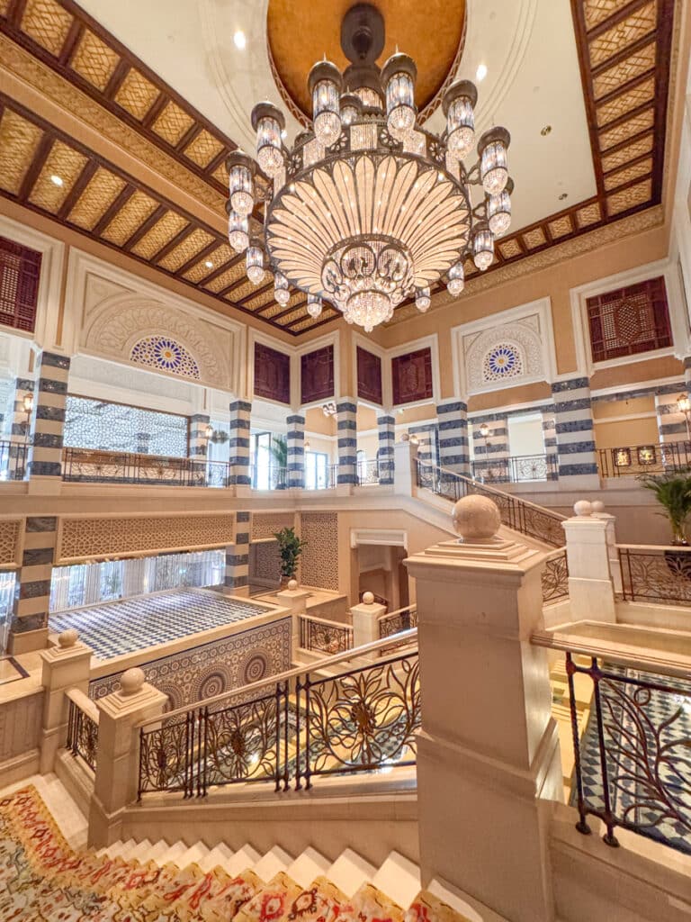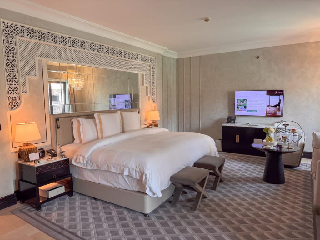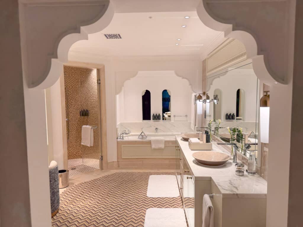 La chambre est spacieuse, lumineuse, avec de grandes baies vitrées donnant sur le lagon. Les boiseries sculptées, les tissus aux motifs arabes et les touches de couleur chaude créent une ambiance authentique, presque féérique. Mais c’est surtout la salle de bains qui m’a impressionné : marbre finement travaillé, baignoire profonde, douche à l’italienne, et ce souci du détail que l’on retrouve partout, des produits d’accueil aux serviettes d’une douceur remarquable.