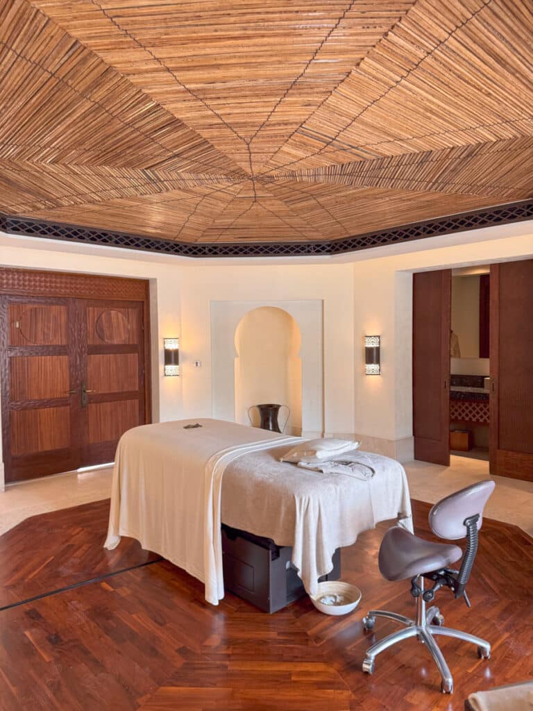 Ce qui frappe dès l’entrée, c’est le charme oriental des lieux : murs couleur sable, lanternes finement sculptées, patios fleuris, bassins paisibles. Le spa a conservé l’âme du Madinat, cette esthétique inspirée des palais arabes, tout en l’associant à une modernité discrète. Les cabines de soins, réparties dans de petites villas au milieu de la végétation, offrent une intimité rare pour un complexe de cette taille. Certaines donnent directement sur les canaux, créant une atmosphère presque méditative avant même le début du soin.