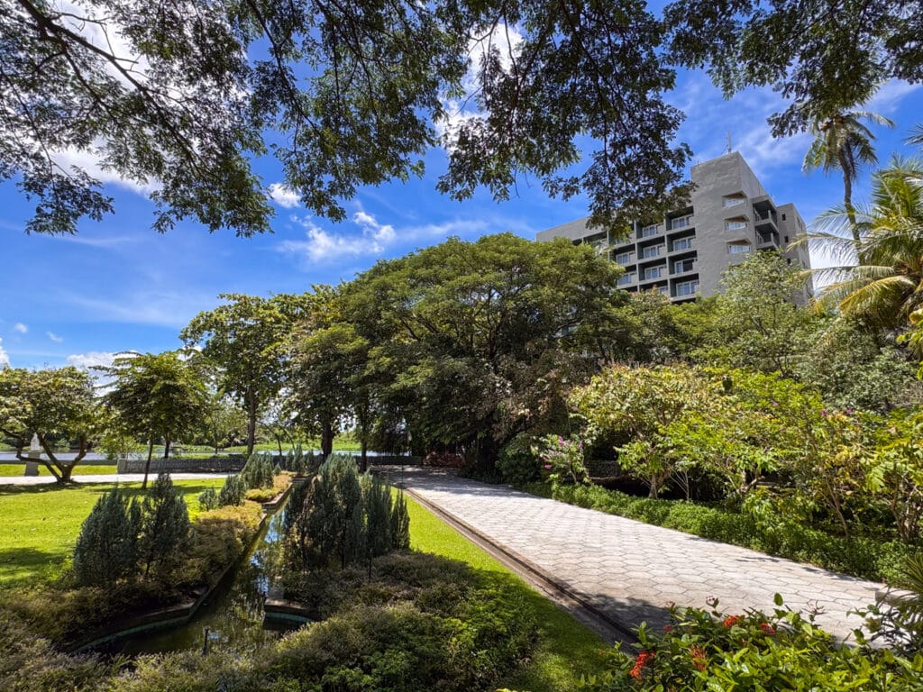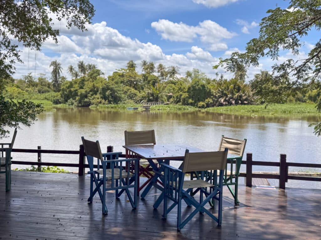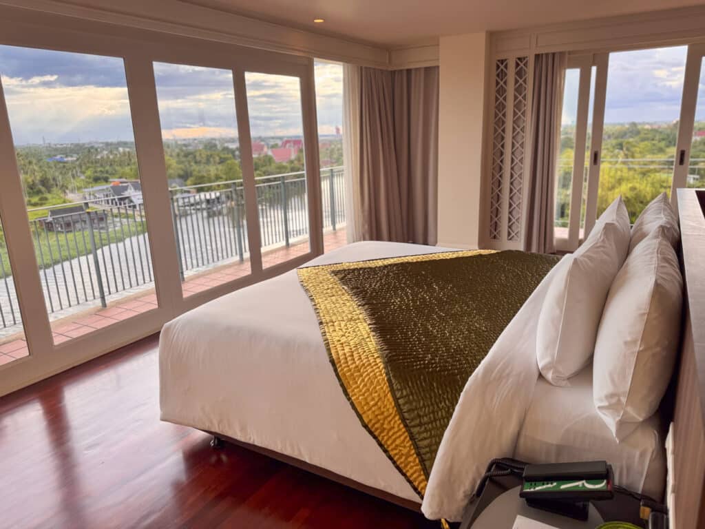 J’étais hébergé dans la grande suite avec vue sur la rivière, tout au sommet de l’édifice. C’est une chambre baignée de lumière, ouverte sur la végétation et l’eau. Les grandes baies vitrées apportent une belle impression d’espace.