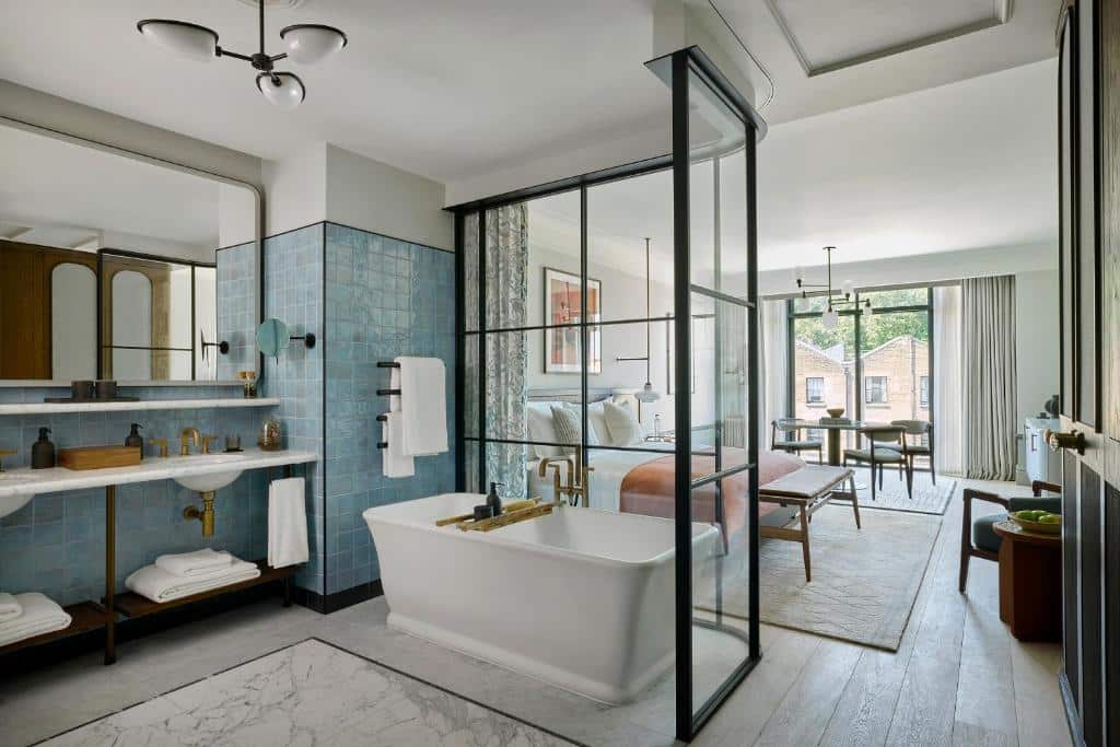 Les 109 chambres et suites du Six Senses London traduisent parfaitement l’esprit du lieu : une esthétique apaisée, lumineuse. AvroKO et EPR Architects ont imaginé des espaces où les textures douces — bois clair, faïences pastel, tissus naturels — se mêlent à des pièces plus graphiques, comme ces douches vitrées aux montants noirs, clin d’œil subtil aux cabines téléphoniques londoniennes. Un détail à la fois moderne et ancré dans la ville, qui crée un jeu de transparence et laisse circuler la lumière.